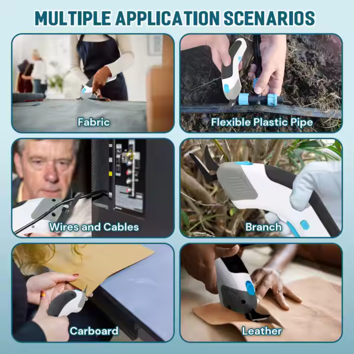 Sharp Scissors Multi-purpose Electric Cordless Scissors are equipped with sharp scissors, which can easily and quickly cut fabrics, cardboard, cloth, leather, paper, plastic, wallpaper, carpet, and even tin/aluminium plates. It is also a good helper for do-it-yourself at home.