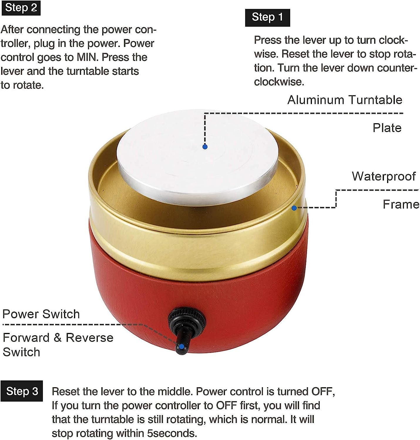 Power On: After connecting the power controller, connect to the power source. Turn the power control to Minimum, press the lever, and the turntable starts to rotate.